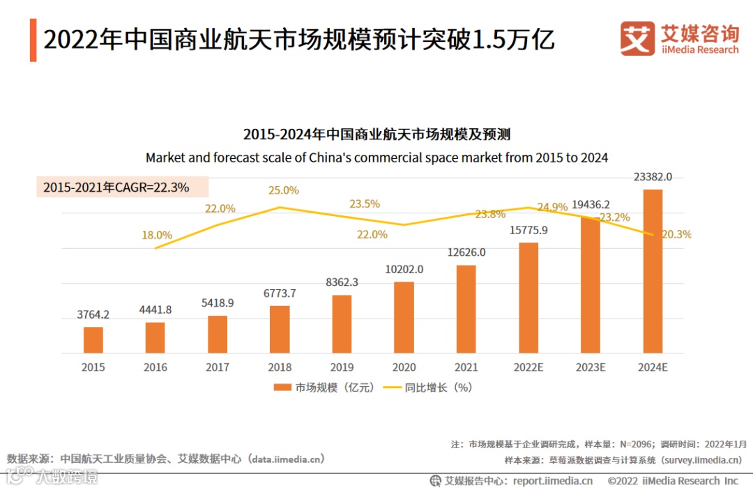 在政策和资本等多方加持下,2015-2021年中国商业航天产业保持着22.3%的年均复合增长率。
