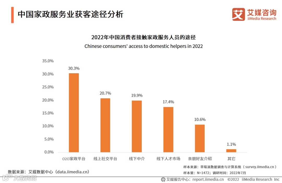 调研数据显示,2022年中国消费者接触家政服务人员的途径TOP3分别是O2O家政平台、线上社交平台以及线下中介,超过五成消费者通过线上渠道匹配到家政服务人员。艾媒咨询分析师认为,家政雇主用户需求的线上化倒逼着家政服务企业的数字化转型,数字化运营、数字化获客、智能客服等线上功能将得到快速推进。