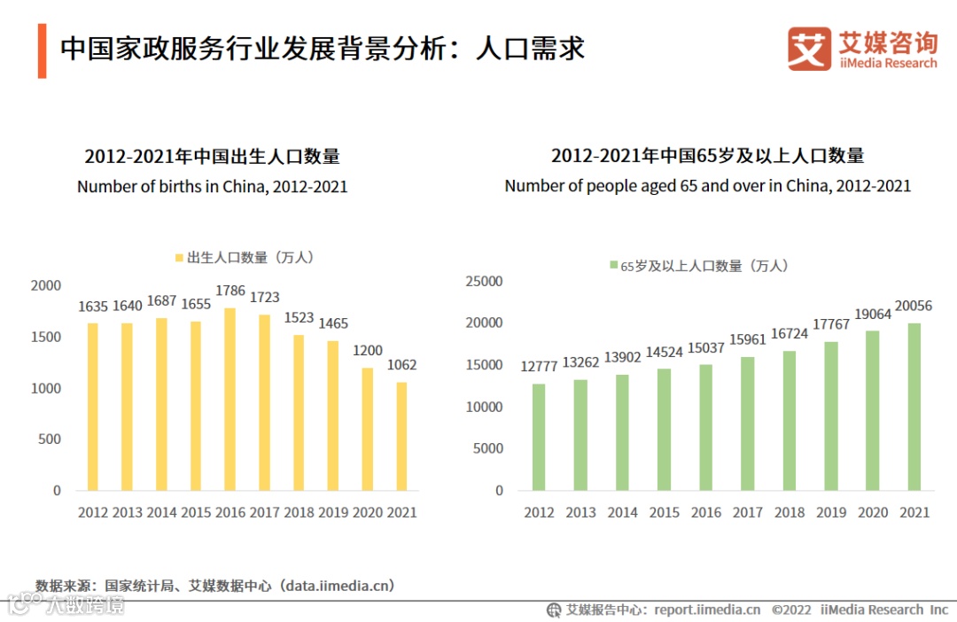 2021年,中国出生人口数量为1062万人,65岁及以上人口数量为20056万人,人口老龄化趋势越发严峻。艾媒咨询分析师认为, “一老一小”是家政服务的主要对象,围绕孩子和老人的家政服务将持续保持高热度。中国社会的家庭小型化、人口老龄化进程加快,加之二胎政策、三孩政策的推行,创造了大量对于家政服务的潜在需求。