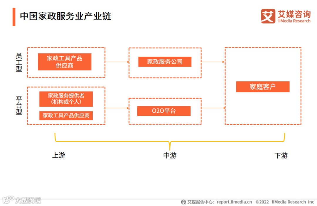 中国的家政服务业产业链根据其商业模式发生变化。在员工型模式下,上游为家政工具产品供应商,中游为家政服务公司,下游为家庭用户;在平台型模式下,上游为家政工具产品供应商和家政服务提供机构或家庭服务员个人,中游为O2O平台,负责吸引家政服务提供者进驻,下游为家庭客户。