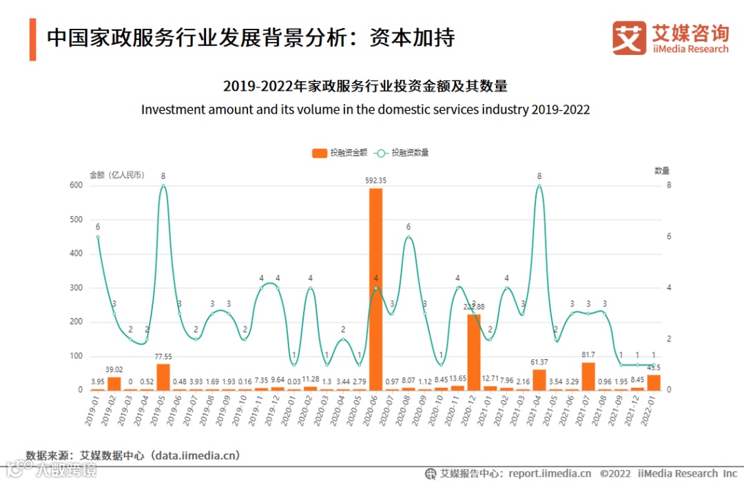 数据显示,2019年至2022年的家政服务行业发展过程中,投融资金额曾于2020年6月达到一个顶峰,金额高达592.35亿元;2019年5月与2021年4月,投融资数量达到顶峰,皆为8起。虽然新冠肺炎疫情对作为服务业的家政服务行业造成了一定冲击,但养老护理的刚需、人口老龄化等因素仍使资本对家政服务行业保持乐观态度。