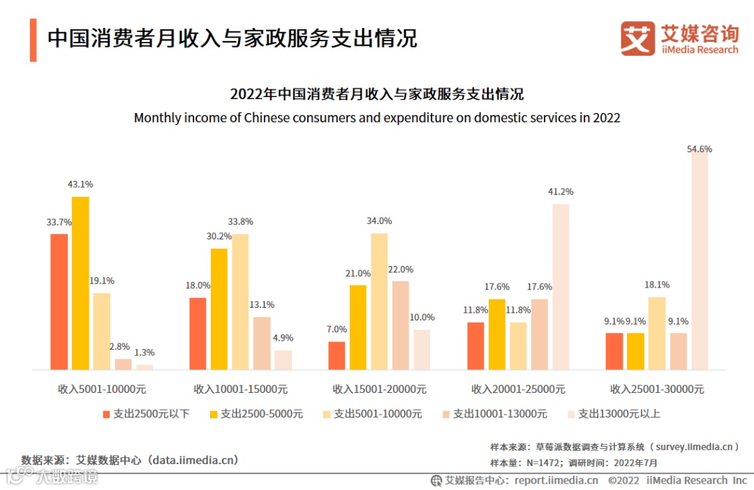 调研数据显示,不同收入层面的中国消费者在家政服务支出方面的情况有所不同,收入越高,家政服务消费水平越高。艾媒咨询分析师认为,中产阶层是家政服务需求的主要群体。月收入区间较高的消费者,对家政服务人员的要求已不仅停留在简单的劳动技能层面,而是更加注重家政服务人员所拥有的知识技能与专业水平,因而所雇用的人员价格更高、支出更大。