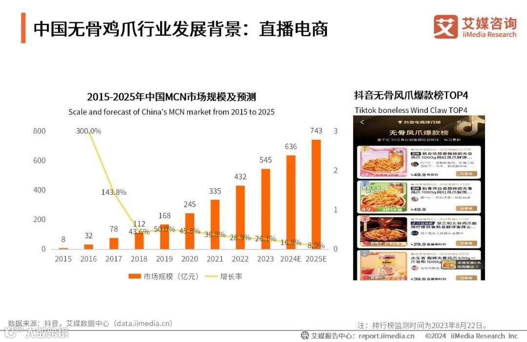 iiMedia Research(艾媒咨询)数据显示,近年来中国MCN市场规模持续扩大,2023年其市场规模达545亿元,预计2025年达743亿元。艾媒咨询分析师认为,中国MCN市场扩大,直播电商作为新兴网红经济的一种形式也在迅速崛起,为无骨鸡爪行业开辟新的销售路径,为其带来重要的商业机会与发展空间。无骨鸡爪企业纷纷参与其中,推动无骨鸡爪进入大消费时代,脱骨侠、邹三和等品牌的无骨鸡爪产品在抖音均居于爆款榜高位。