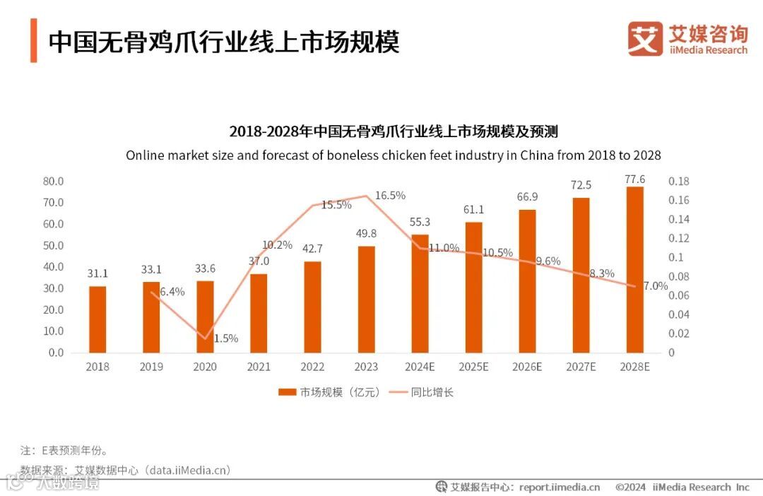 iiMedia Research(艾媒咨询)数据显示,2023年中国无骨鸡爪行业线上市场规模为49.8亿元,同比增长16.5%,2028年其市场规模有望达77.6亿元。艾媒咨询分析师认为,随着国民生活质量不断提升以及消费需求的扩大,在“宅经济”和快节奏的现代生活等多重影响下,无骨鸡爪消费场景逐渐增多,行业将持续扩容。