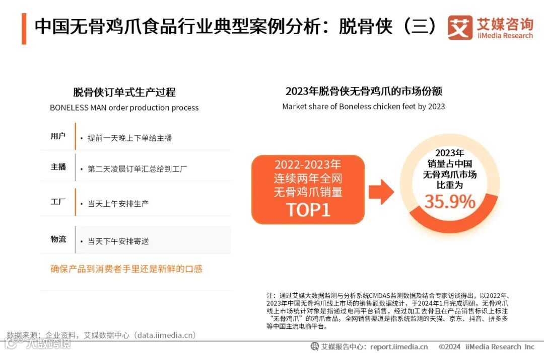 脱骨侠采用订单式的生产流程,通过用户、主播、工厂和物流的紧密协作,实现从订单获取到产品寄送的快速响应,确保产品的新鲜和口感。2022-2023年脱骨侠连续两年全网无骨鸡爪销量第一,其2023年销量占中国无骨鸡爪市场比重为35.9%。