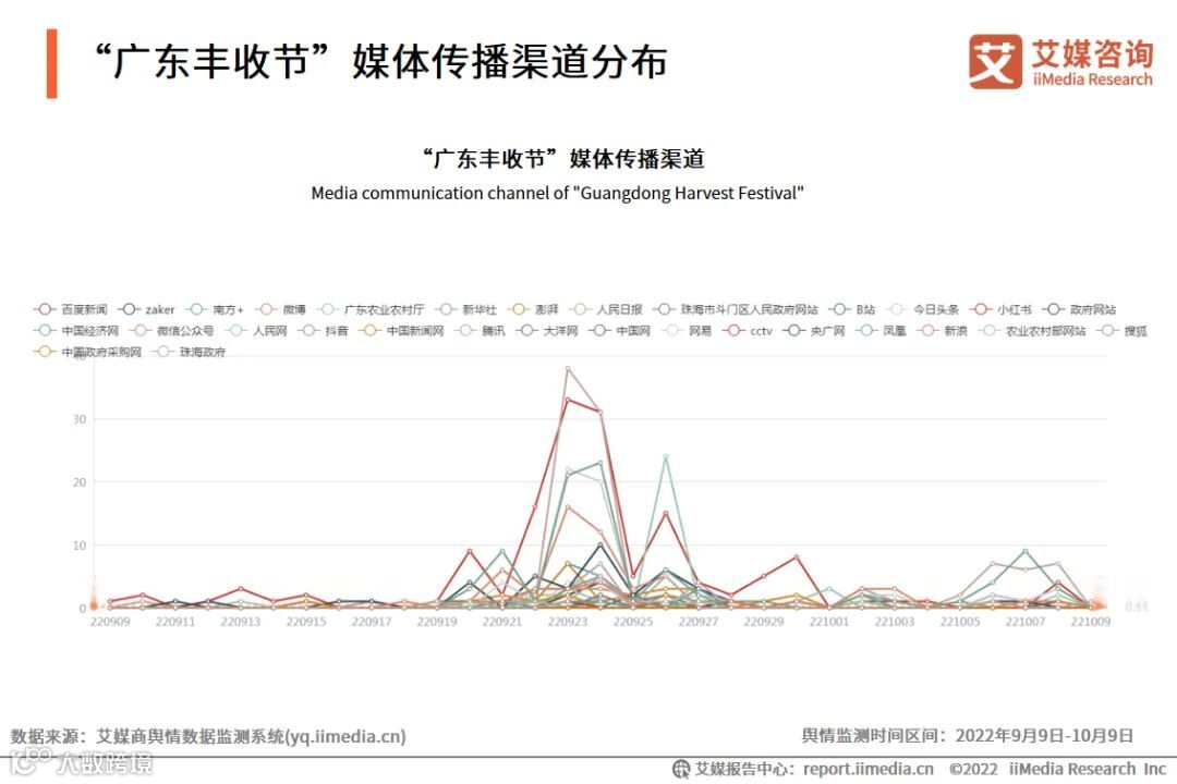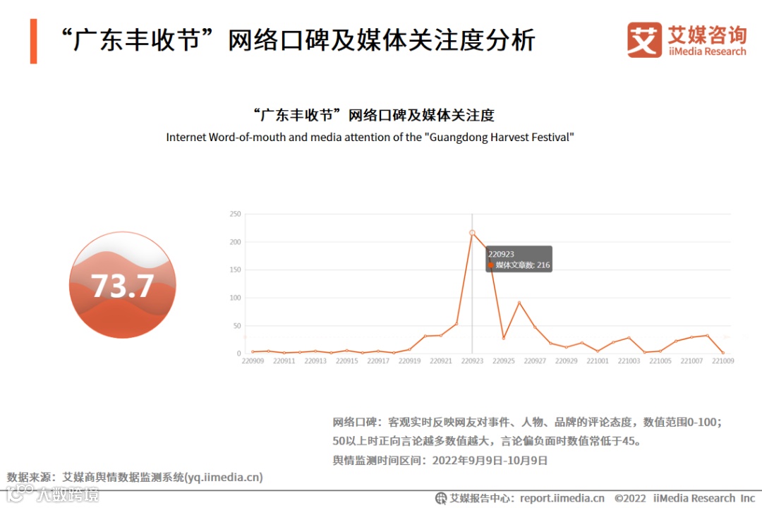 9月23日,广东省庆祝2022年“中国农民丰收节”主会场活动(以下简称“广东丰收节”)在珠海市斗门区启幕。活动采取1+N的模式,联动各大电商平台、机构开设“线上丰收节”,直播联动推介广东预制菜、特色优质农产品,助力“粤字号”农产品品牌打造。数据显示,广东丰收节的媒体关注度在开幕式当天达到最高峰;网络口碑指数为73.7,反映出网民对本届活动整体评价较高。