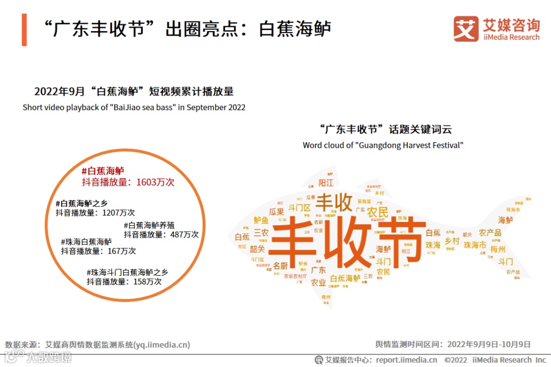 艾媒监测数据显示,白蕉海鲈、珠海、斗门区等成为今年广东丰收节相关话题的高频词云。在珠海斗门举办的2022年中国农民丰收节广东主会场上,中华八大菜系名厨联袂制作“白蕉海鲈一桌菜”,引发消费者的热切关注,使得白蕉海鲈成功“出圈”。