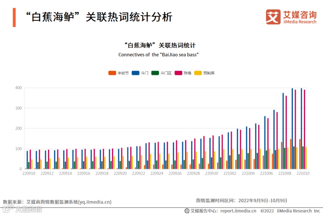 监测数据显示,与“白蕉海鲈”关联热度最高的词语为斗门、珠海、丰收节、预制菜。借助中国农民丰收节的契机,白蕉海鲈品牌得到更好的传递,自9月23日起,其网络热度大幅提升,“珠海”“斗门”关联词热度也实现了近4倍的增长。