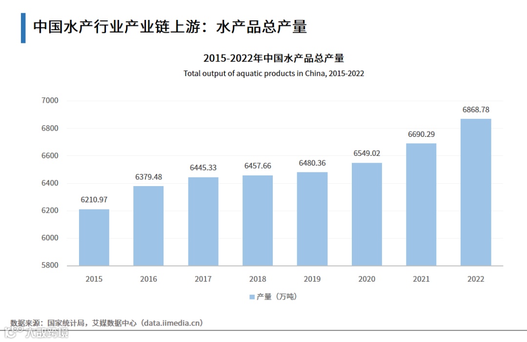 近几年,中国水产行业稳步推进,发展规模不断扩大,产量快速提升。数据显示,2015-2022年中国水产品总产量逐年递增,2022年达6868.78万吨。水产品作为重要的食品来源,富含蛋白质及各种微量元素,符合人们对健康和饮食的需求,这将持续带动水产行业供应端的增长。