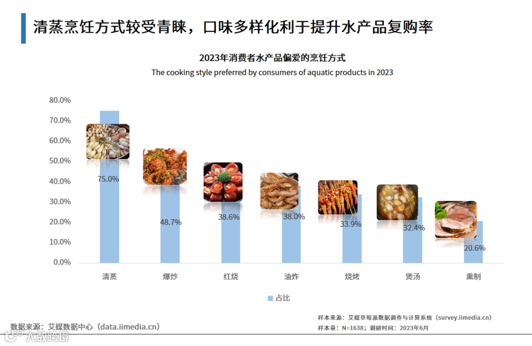 作为渔业大国,中国水产品种类多样,营养价值丰富,能够满足不同消费需求。iiMedia Research(艾媒咨询)数据显示,对于水产品的烹饪方式,75.0%消费者偏爱清蒸,其次为爆炒、红烧、油炸。水产品符合国民健康养生的生活需求,清蒸可以还原食物本味,因此较受青睐。水产品口味的延展创新利于持续调动消费者新鲜感,吸引其持续复购。