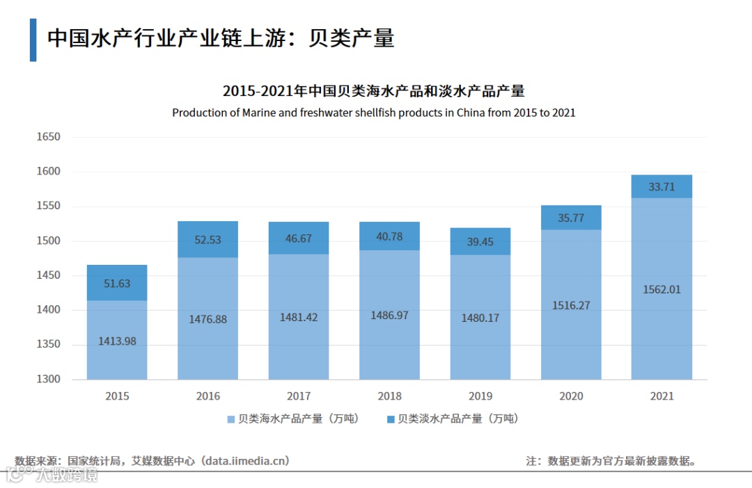 随着中国对水产品消费需求的增长,海水养殖总产量持续提升,贝类作为其主要品种,产量较高。数据显示,在中国贝类产品产量中,海水产品产量占据较大市场份额,2021年贝类海水产品和淡水产品产量分布达1562.01万吨、33.71万吨。