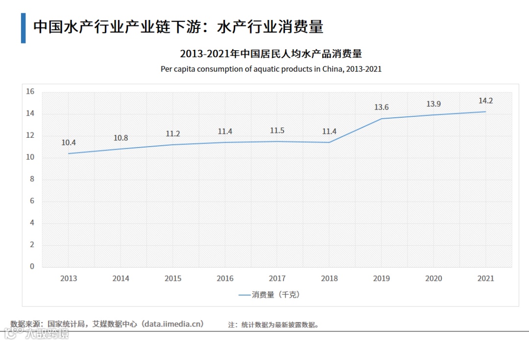 水产品在膳食结构中的比重不断增加,促使中国水产品需求持续增长。数据显示,2013-2021年中国居民人均水产品消费量大体保持增长态势,2021年已达14.2千克。目前,中国水产品养殖企业多以个体经营模式为主,规模化大型企业少,市场集中度较低。随着科学养殖意识逐渐增强,水产养殖逐渐实现标准化、规模化,给水产品深加工带来稳定的原料供应。