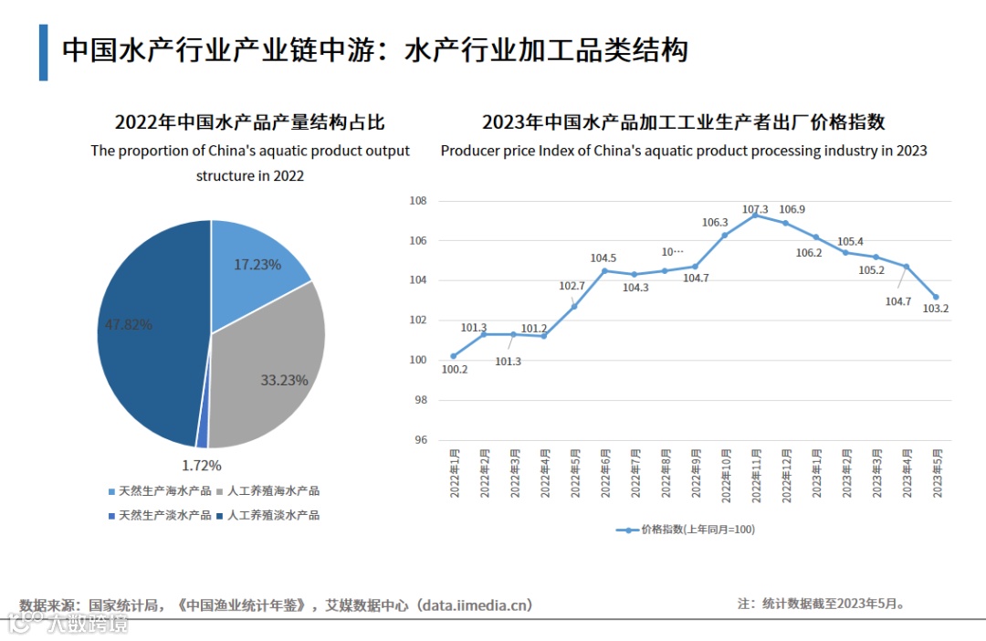 数据显示,2022年中国人工养殖淡水产品和人工养殖海水产品占比较高,分别为47.82%、33.23%;2023年1月至5月,中国水产品加工工业生产者出厂价格指数持续下降,水产加工行业经济下行,政府和企业需加强合作,共同应对市场变化,促进水产行业的稳定发展。