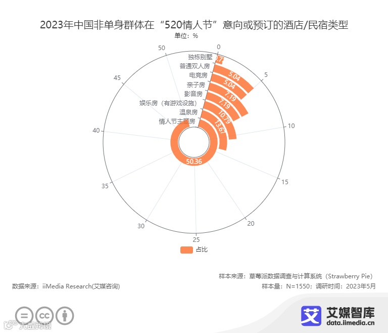 此外,随着微度假旅游模式与“主题式”民宿的兴起,住宿游玩一体化成为新的消费趋势。本次调研中有20.47%的消费者选择“520情人节”在酒店或民宿中度过,其中情人节主题房最受消费者的喜爱,占比达50.36%;其次是温泉房(13.67%)和娱乐房(10.79%);在七夕或520这种充满爱意的节日里,不少酒店会推出情人节主题营销活动,为入住的情侣提供浪漫的节日布置、精美玫瑰花、进口红酒、可口餐点等,为入住客户留下甜蜜回忆。