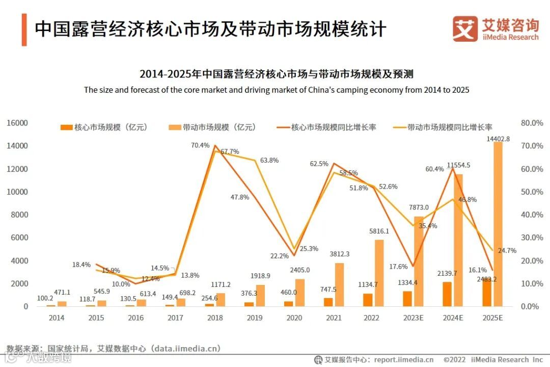 iiMedia Research(艾媒咨询)数据显示,中国露营经济核心市场规模和带动市场规模均呈现逐年上升的趋势。2022年中国露营经济核心市场规模达到1134.7亿元;带动市场规模为5816.1亿元,同比增长率为58.5%。预计2025年中国露营经济核心市场规模将上升至2483.2亿元,带动市场规模将达到14402.8亿元。随着消费升级,越来越多的消费者加入到露营活动中,露营及其相关产业在中国有着较大的发展空间。[4]