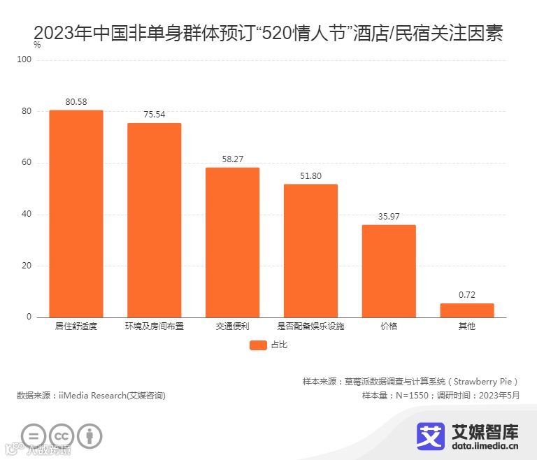 从消费者意向预订的酒店或民宿价格看,主要集中在600-899元,占比42.45%。80.58%的受访者在预订酒店或民宿时,优先关注的是居住舒适度,其次是环境及房间布置、交通便利性和是否配备娱乐设施,价格不再成为首要关注因素,消费者更关注商家能否通过增添浪漫元素来为服务营造浪漫氛围。酒店和民宿应要抓住节日度假需求的改变,将“流水线”式的标准间进一步向个性化发展,满足消费者的浪漫需求。