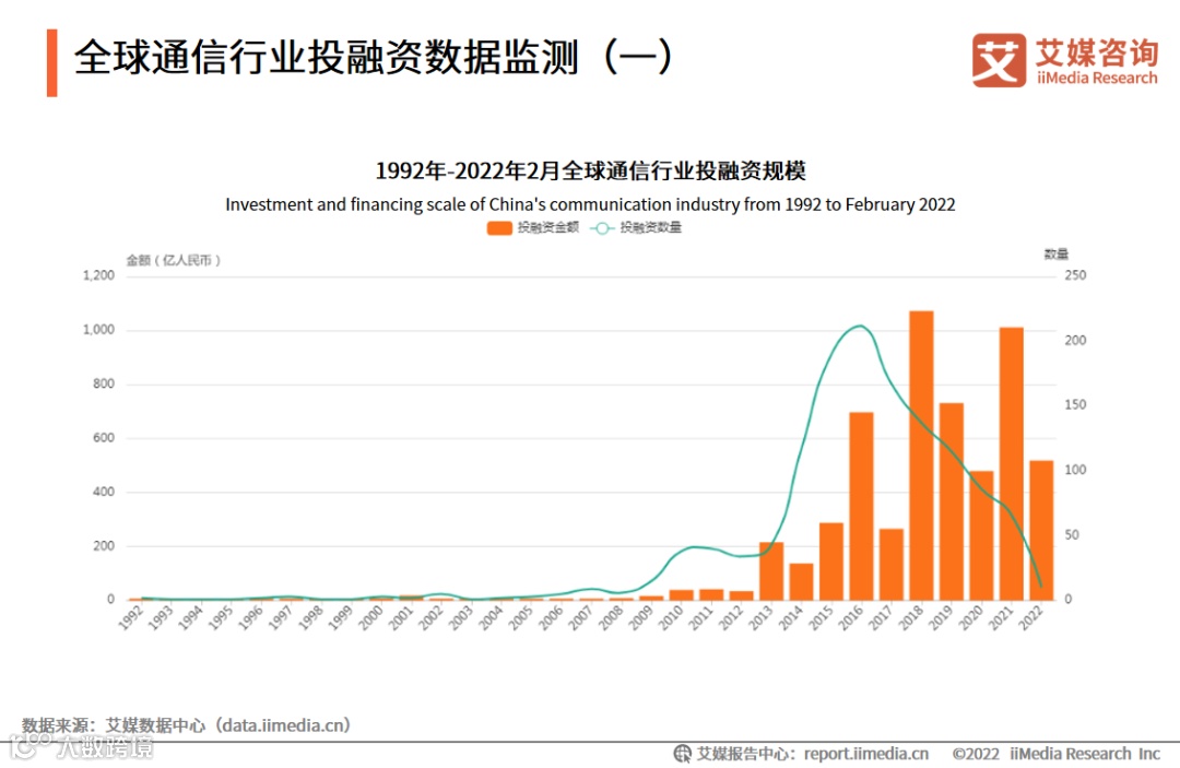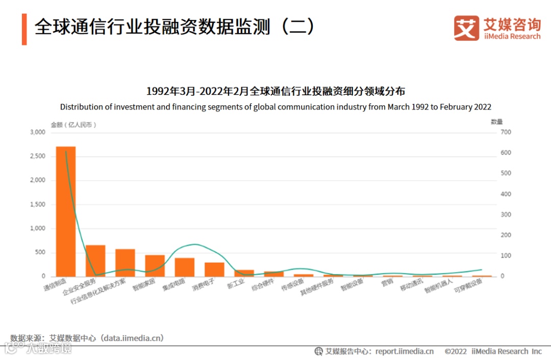 数据显示,2021年全球通信行业发生投融资事件66起,金额达10111.3亿人民币。2022年,截止2月底,投融资金额达518亿人民币,受资本关注度较高。