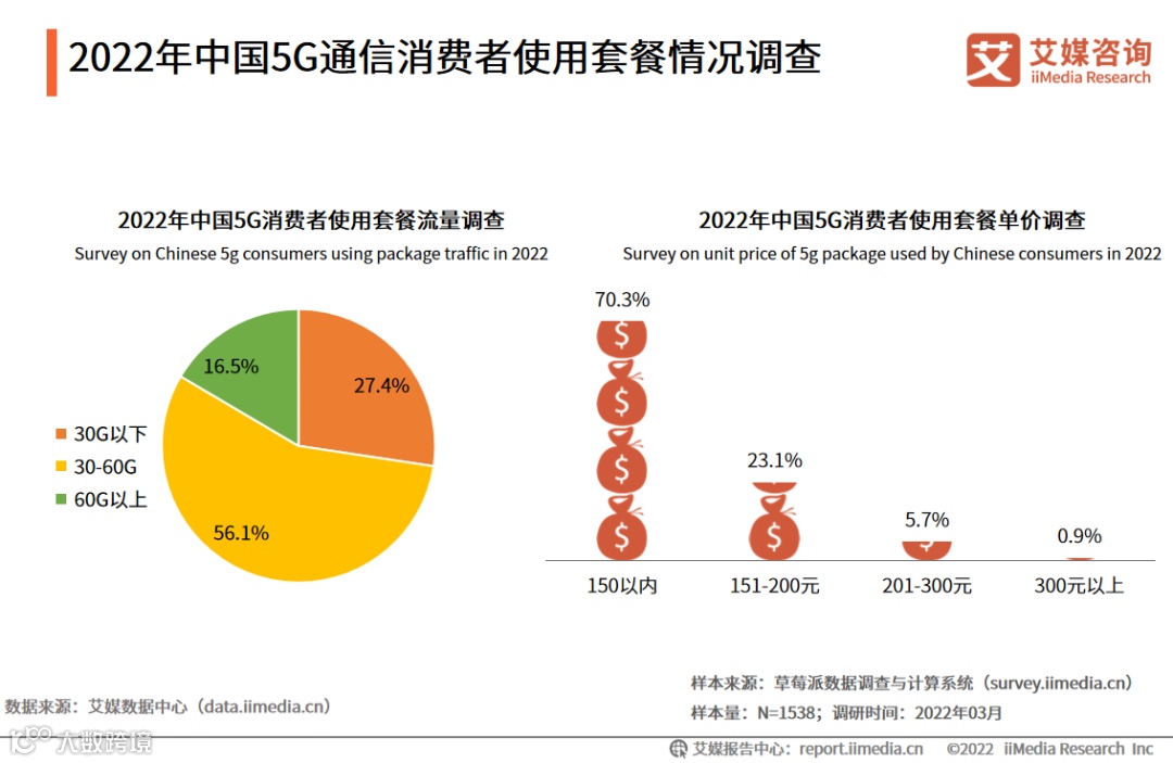 调研数据显示,中国使用5G通信的消费者目前套餐流量为30-60G(56.1%),套餐金额集中在150元以内。
