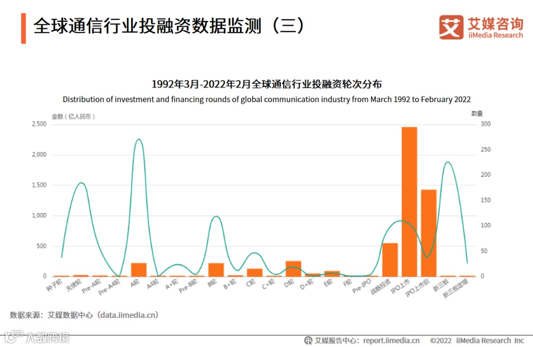 数据显示,全球通信行业投融资轮次在天使轮及A轮数量较多,其中在A轮的投融资事件达271起;IPO上市的投融资金额达2458.4亿人民币。