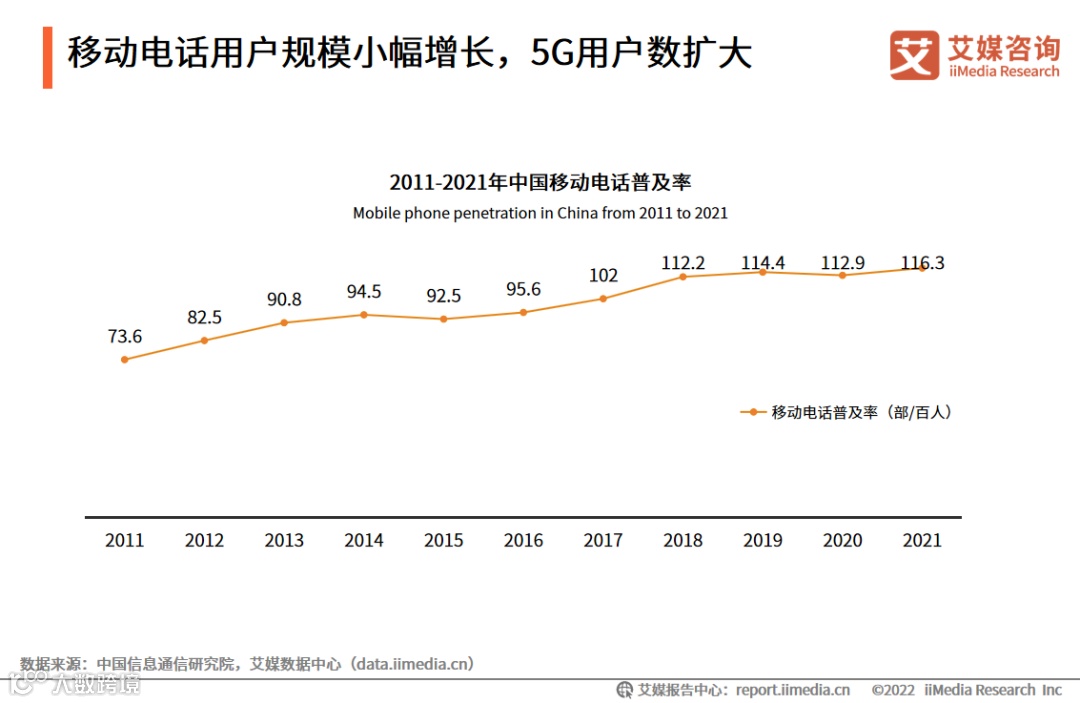 2021年,中国移动电话用户总数16.43亿户,全年净增4875万户,普及率为116.3部/百人,比上年末提高3.4部/百人。其中,4G移动电话用户为10.69亿户,5G移动电话用户达到3.55亿户,二者占移动电话用户数的86.7%(其余为3G)。