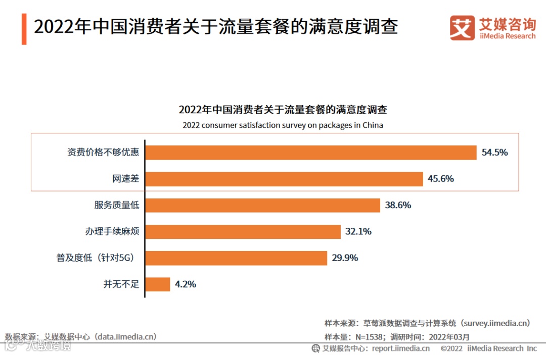 调研数据显示,有54.5%的通信行业消费者认为当前在使用的套餐价格不够优惠,有45.6%的消费者认为流量套餐的网速较差。