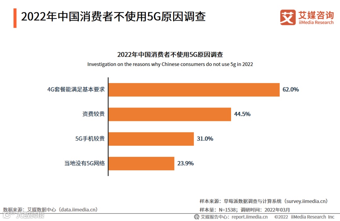 调研数据显示,有62.0%的消费者表示不使用5G的原因是,4G可满足自己日常需求,还有部分消费者认为5G套餐费用较高、5G手机较贵、当地没有5G网络。