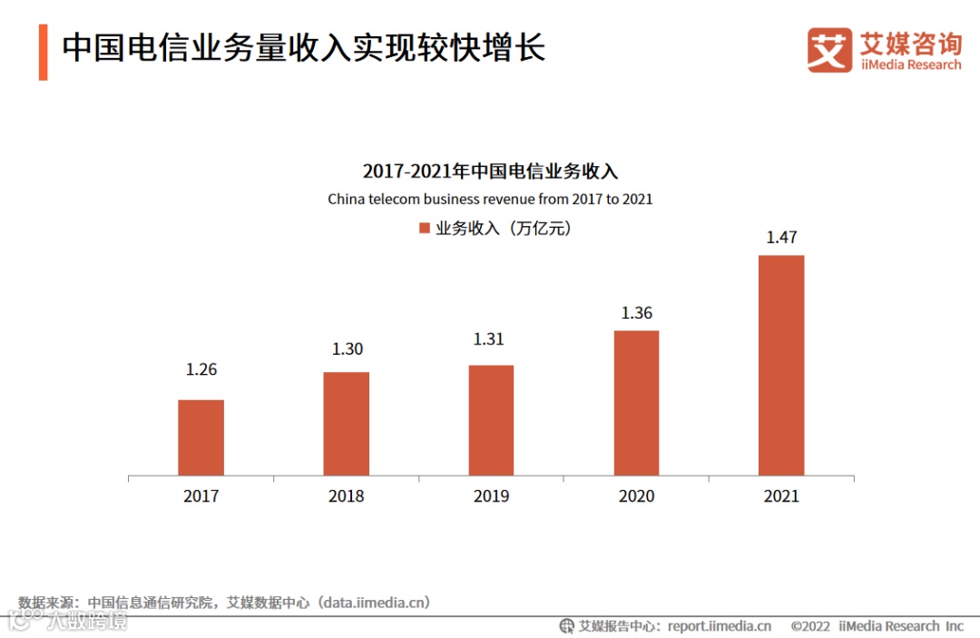 2021年,中国电信业务收入累计1.47万亿元,比上年增长8.0%,实现了近年来较高增长水平,增速较上年提高4.1%。