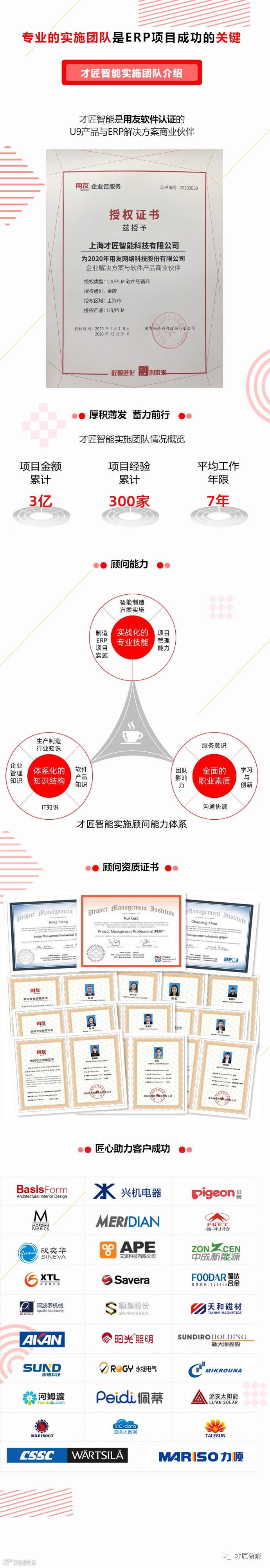 才匠智能实施团队平均工作年限7年,累计项目经验300家,累计项目金额高达3亿,是一支厚积薄发的优质团队。