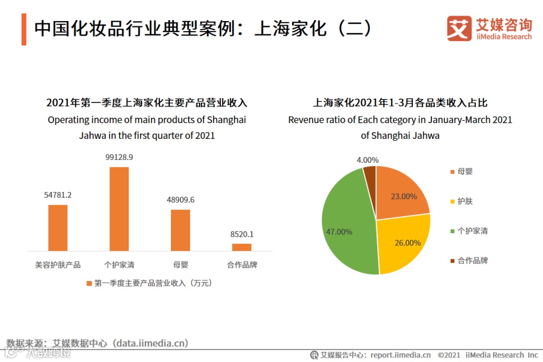 2021年第一季度,上海家化的销售额增长,实现营业收入21.15亿元,同比增长27%;净利润1.69亿元,同比增长41.9%。旗下美容护肤产品销量为2251.21万支,同比增长703.48万支,同比增长31.25%;营收5.48亿元,同比增长39.24%。数据显示,个护家清是上海家化收入的主要品类,2021年1-3月,个护家清品类收入占整体收入的47%,,营业收入达99128.9万元。
