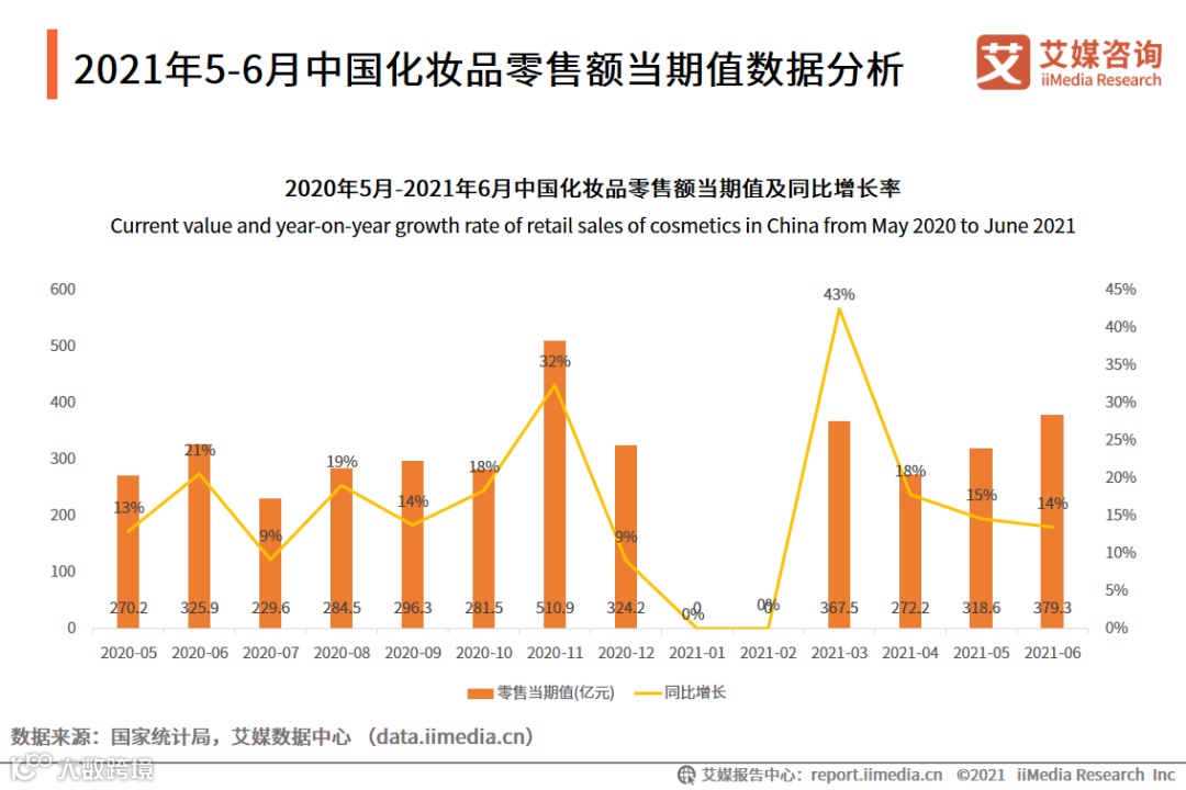 5. 2021年5-6月中国化妆品零售额当期值数据分析
