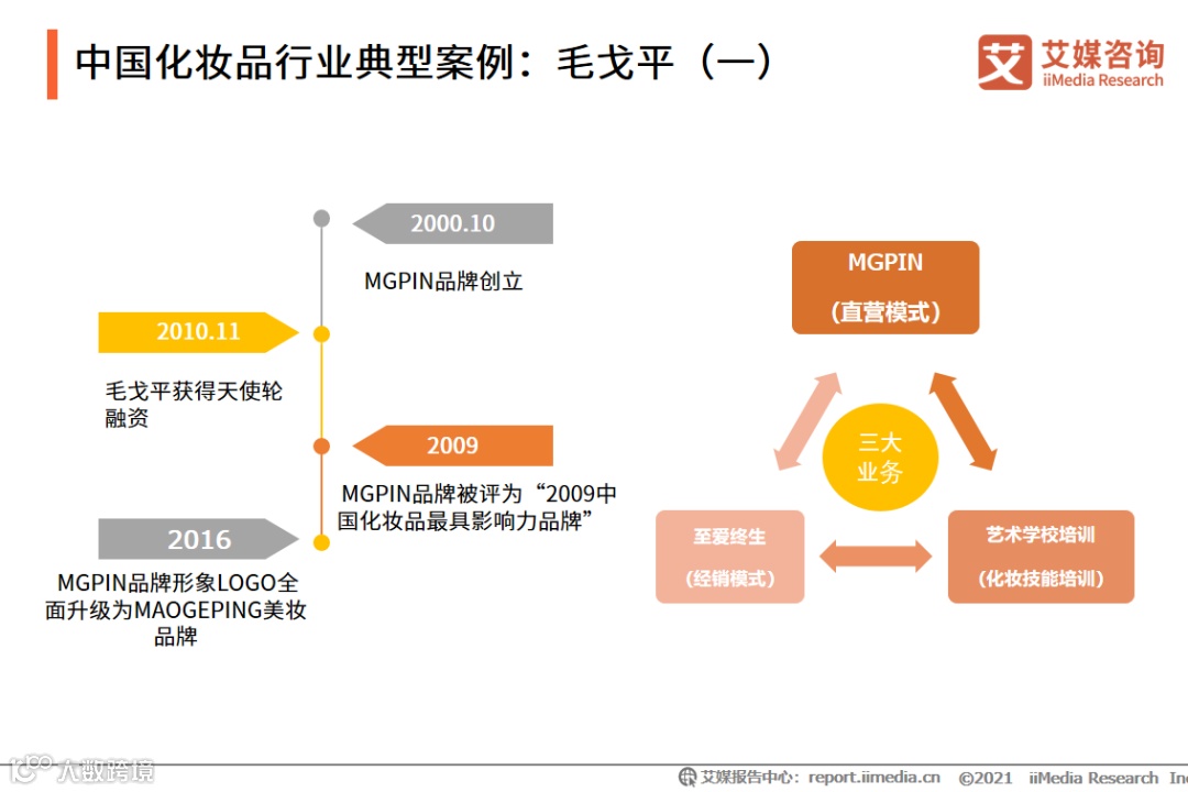 毛戈平MGP是一家从事化妆品销售的电子商务公司,于2000年创立,公司主要业务为MGPIN与至爱终生两大品牌系列产品的研发、 生产、销售及艺术学校培训。“MGPIN”为毛戈平公司核心品牌,主要面向都市女性,以中高端百货专柜直营模式为主;“至爱终生”品牌面向二、三线城市女性消费者,以经销模式为主;毛戈平在北京、上海等七个城市均设有培训机构,为学员提供化妆技能培训服务。