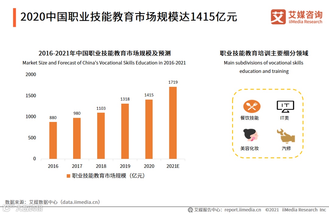 职业技能教育按照国家规定的职业标准,通过政府授权的考核鉴定机构,对劳动者的专业知识和技能水平进行客观公正、科学规范地评价与认证的活动。2020年,职业技能教育市场规模达1415亿元,艾媒咨询分析师认为,中国职业技能教育市场规模未来将会持续保持增长,预计2021年市场规模将达到1719亿元。
