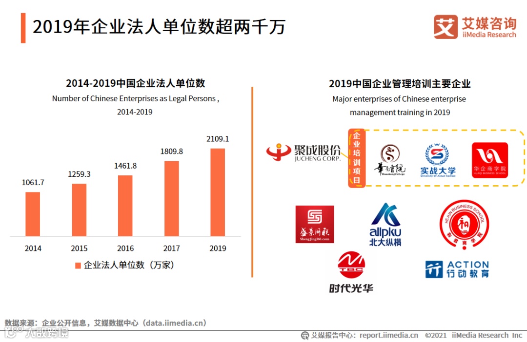 2019年,中国企业法人单位数达2109.1万个,比2017年新增约300万个。企业数的增长,为管理培训业务提供庞大的客户基础。但目前,管理咨询培训行业由于不存在重大技术或科技依赖,行业进入门槛较低,行业竞争较为激烈。从行业内的竞争能力看,聚成股份、盛景网联、行动教育、和君商学院、北大纵横、行动教育等企业目前处于行业领先水平。