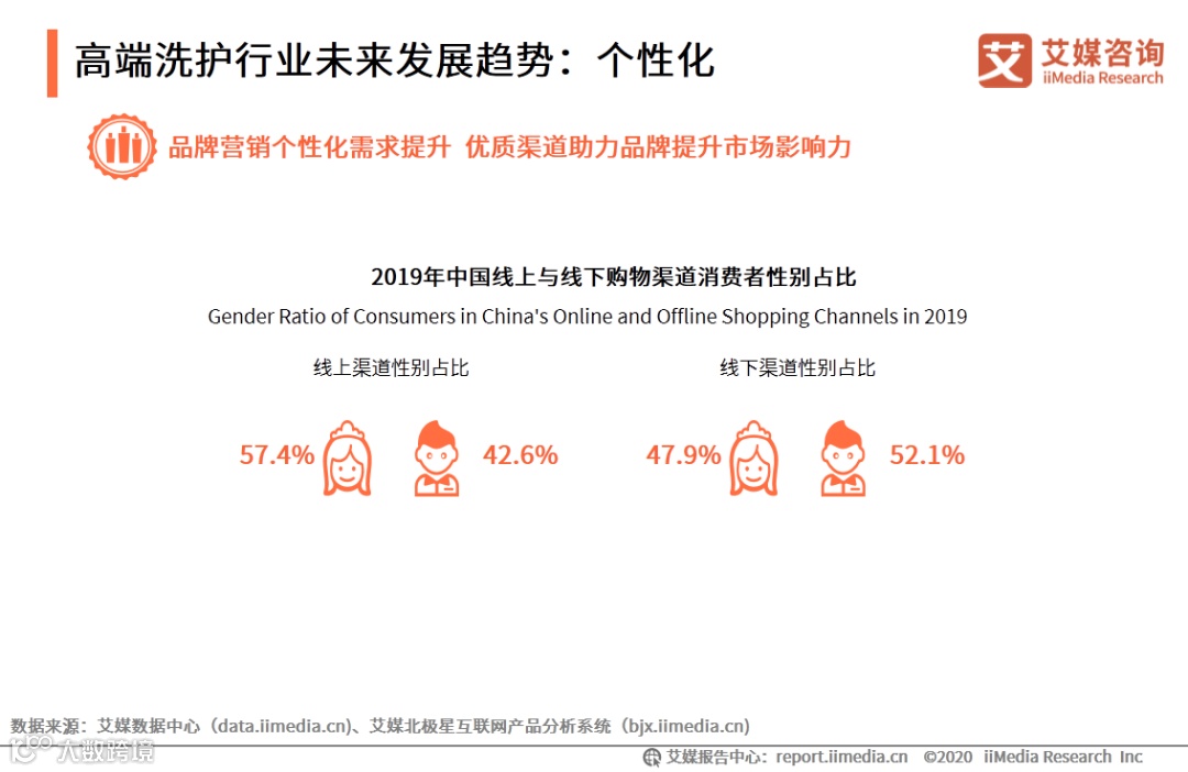 iiMedia Research(艾媒咨询)数据显示,在线上渠道购物的消费者主要以女性为主,占比近六成;而在线下渠道的消费者中男性用户占比偏多,达到52.1%。在洗发护发高端产品的使用方面,女性重视头发护理与保养,而男性更重视洗发与美发造型产品。艾媒咨询分析师认为,随着品牌营销个性化需求逐步提升,针对不同人群的营销策略需进一步细分。同时,优质渠道也将进一步助力高端洗护品牌,发挥大数据以及智能化渠道优势,帮助品牌实现市场竞争的争夺。