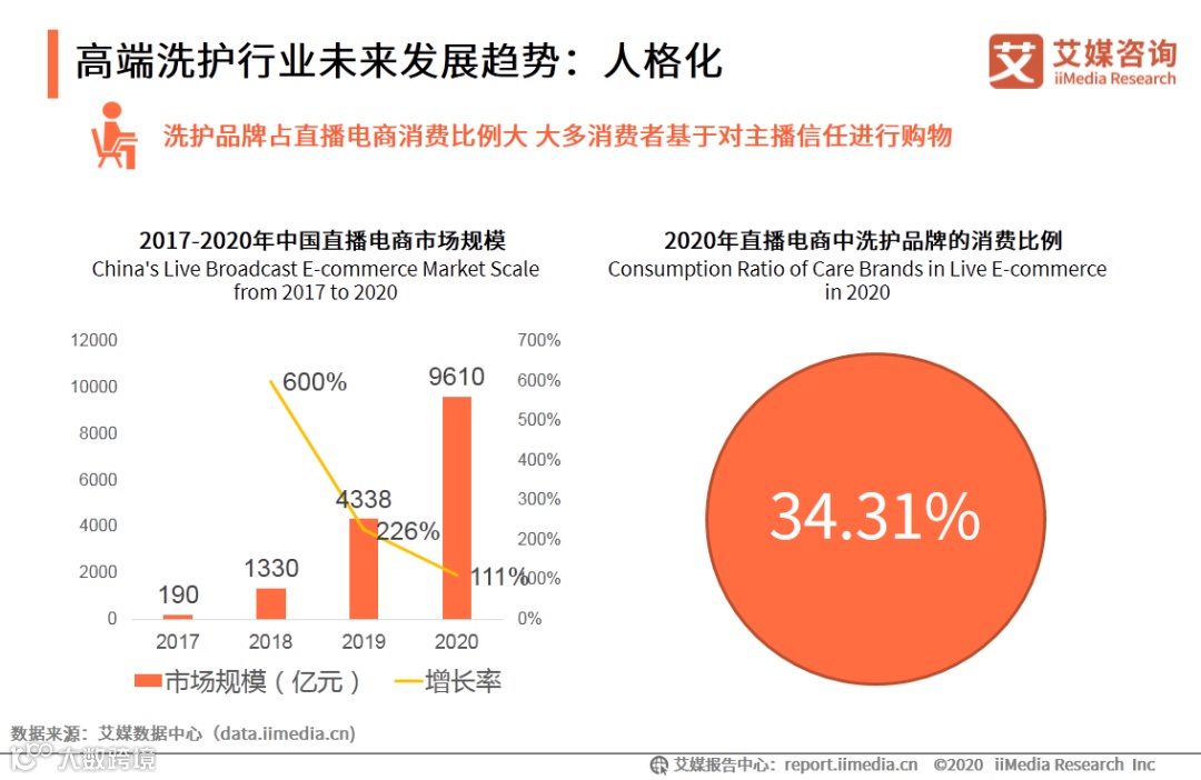 2020年中国直播电商市场规模达到9610亿元,其中洗护品牌的消费占34.31%。大多消费者会基于对主播的信任对商品产生购买欲望,主播应当找准自身定位,根据私域流量特点稳定输出内容。