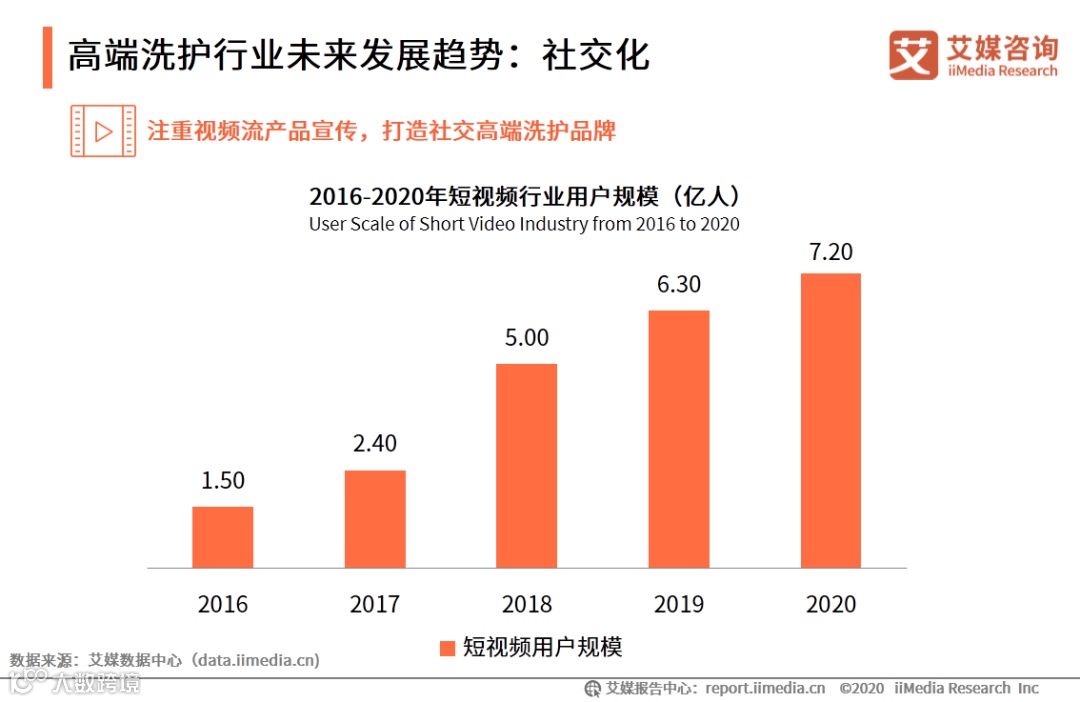 iiMedia Research(艾媒咨询)数据显示,2020年短视频行业的用户规模达到7.20亿,在短视频行业发展稳定的阶段,垂直领域短视频内容开始呈现发展潜力,“短视频+电商”得到众多用户的喜爱。未来高端洗护品牌将充分融合短视频工具渠道,实现商品外观及产品功效等方面的多维展示,打造年轻化、潮流品牌。