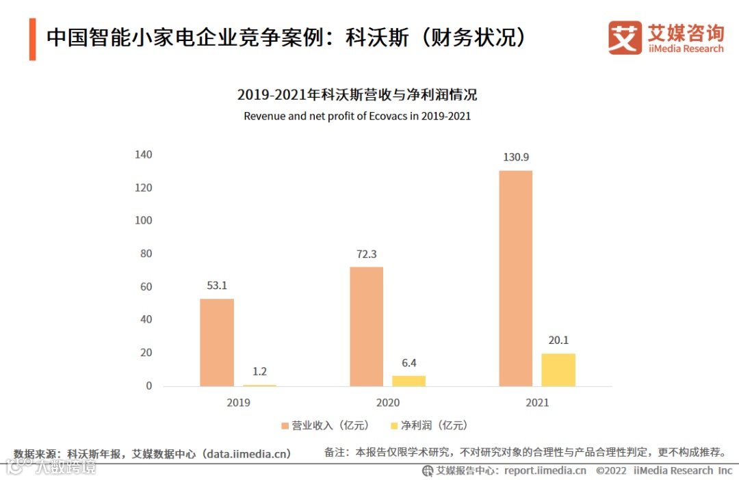 2021年,科沃斯营业收入为130.9亿元,同比上年增长80.9%,净利润为20.1亿元,同比上年增长213.5%,迎来双增长。艾媒咨询分析师认为,双增长的实现,是由于在2020年成功打造添可品牌规模业务的基础上,科沃斯又在2021年继续深化科沃斯加添可的双轮驱动战略,成功推出多款畅销全球的家用服务机器人及高端智能生活电器产品,推动了两大品牌业务收入实现快速增长。