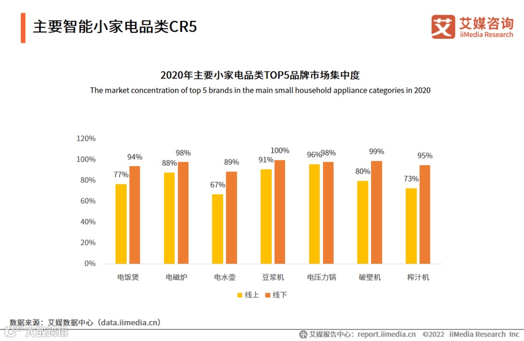 智能小家电市场的线下渠道,如电饭煲、电磁炉等,已形成美的、苏泊尔、九阳“三足鼎立”的竞争态势,市场集中度较高。数据显示,2020年主要小家电品类TOP5线下市场集中度在85%以上,而豆浆机、电磁炉、电压力锅等品类集中度均超95%,新锐品牌在传统品类线下渠道中实现突围并非易事。