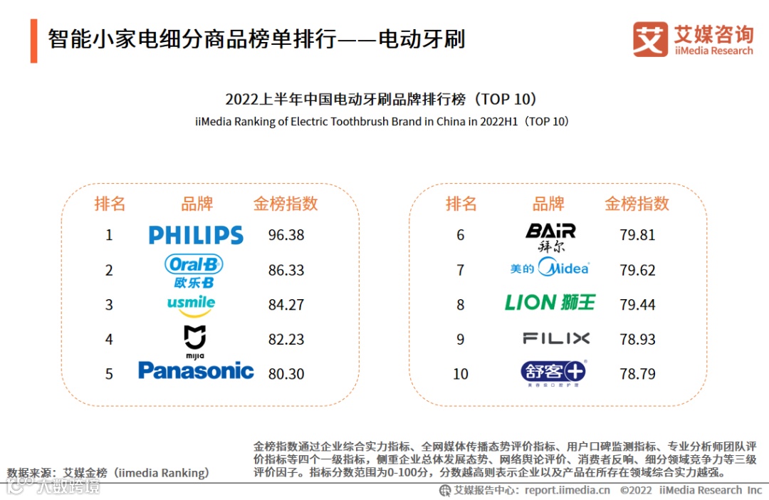 近年来,居民的口腔健康意识逐步增强,在人们收入水平提高和消费升级的浪潮下,电动牙刷成为了中国增长最为迅速的小家电品类之一。在中国市场份额中领先的电动牙刷品牌中,飞利浦、欧乐B优势更明显,综合销售量、行业地位、网络口碑、消费者评价等维度,分别以96.38和86.33的金榜指数排名前二。