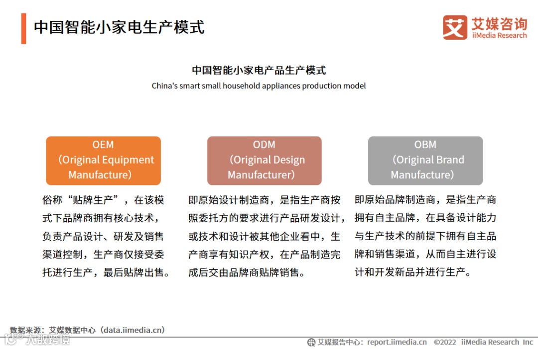 中国智能小家电行业有三类生产模式:OEM、ODM与OBM,前两类主要以代工为主,而OBM主要为原始品牌的自主打造。过去,大部分小家电企业主要扮演代工角色,这主要与企业较为早期的发展阶段及自身资源有关。但代工企业处于小家电产业链的低价值环节,且代工厂门槛较低、竞争较为激烈,导致代工厂缺失议价能力。艾媒咨询分析师认为,当前越来越多的智能小家电制造商致力于从OEM向ODM再到OBM的转型,以实现产业价值链的延伸,获取更高的附加价值。