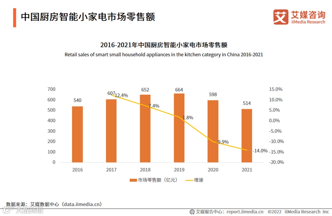 中国厨房小家电零售额从2016年的540亿元增长至2019年的664亿元,2020年在新冠疫情影响下,宅经济带动的火爆销售促使厨房小家电行业快速透支,零售额规模下滑至598亿元,同比减少9.9%,2021年小家电领域厨房烹饪小家电持续承压,零售额为514亿元,同比下降14.0%。