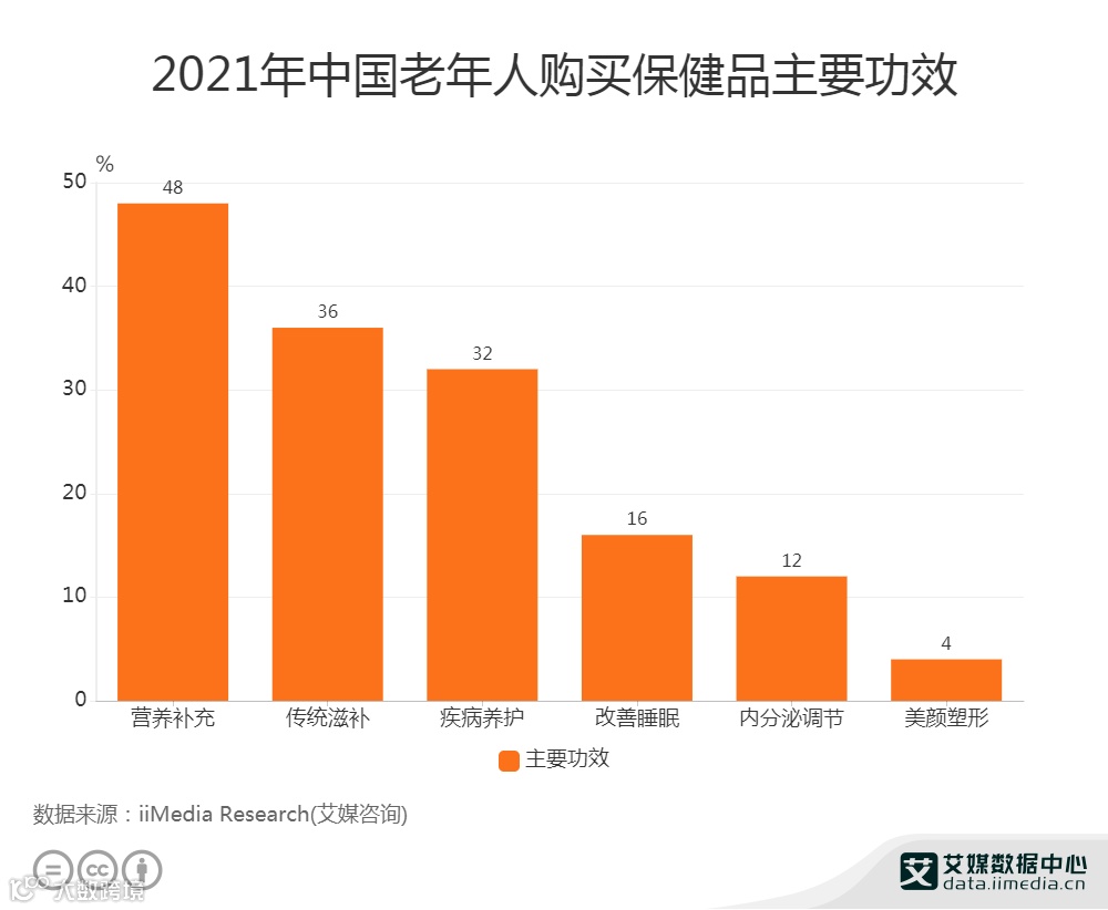 数据显示,2021年,中国48%老年人购买保健品是为了营养补充;36%老年人是为了传统滋补;32%老年人是为了疾病养护;而也有16%老年人为了改善睡眠而购买保健品。