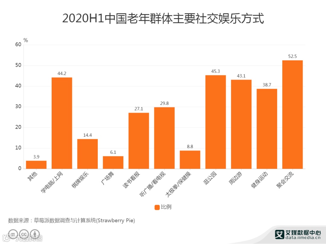老年人的娱乐社交很重要,数据显示,中国52.5%老年群体的主要社交娱乐方式为聚会交流。同时,逛公园(45.3%)、学电脑/上网(44.2%)、周边游(43.1%)、健身运动(38.7%)也是老年群体主要的社交娱乐方式。