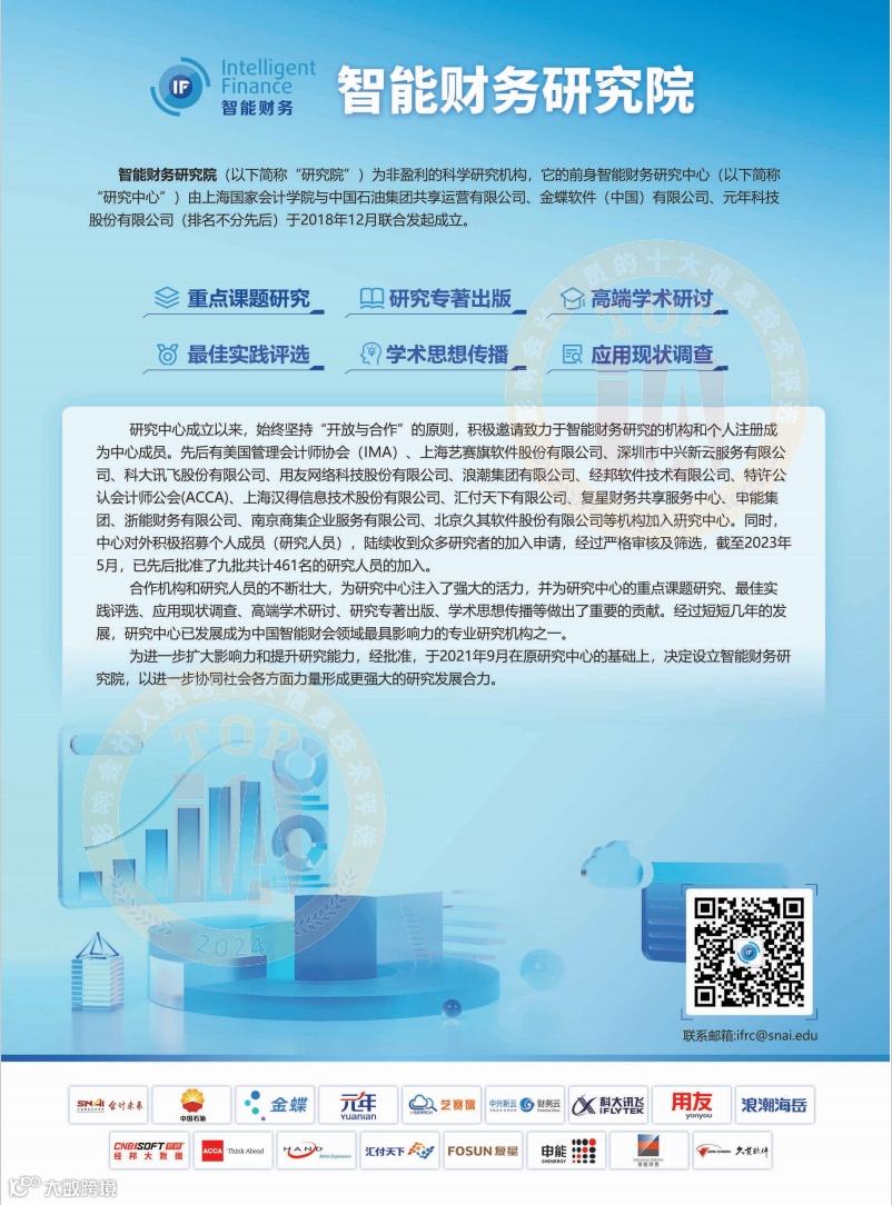 国家会计学院主办了2024年影响中国会计行业的十大信息技术调查活动,活动由浪潮通用软件、用友网络科技、金蝶软件、汉得信息、中兴新云、元年科技六家单位联办,由上海国家会计学院智能财务研究院提供学术支持,