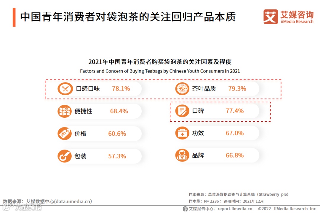 艾媒咨询分析师认为,中国茶生活已成为一种生活方式,品茶长久以来是传统商务接待的普遍场景。区别于传统茶饮,袋泡茶的便捷性更能匹配中国青年快节奏的生活和工作习惯,在年轻群体中获得更为广泛的认知度。
