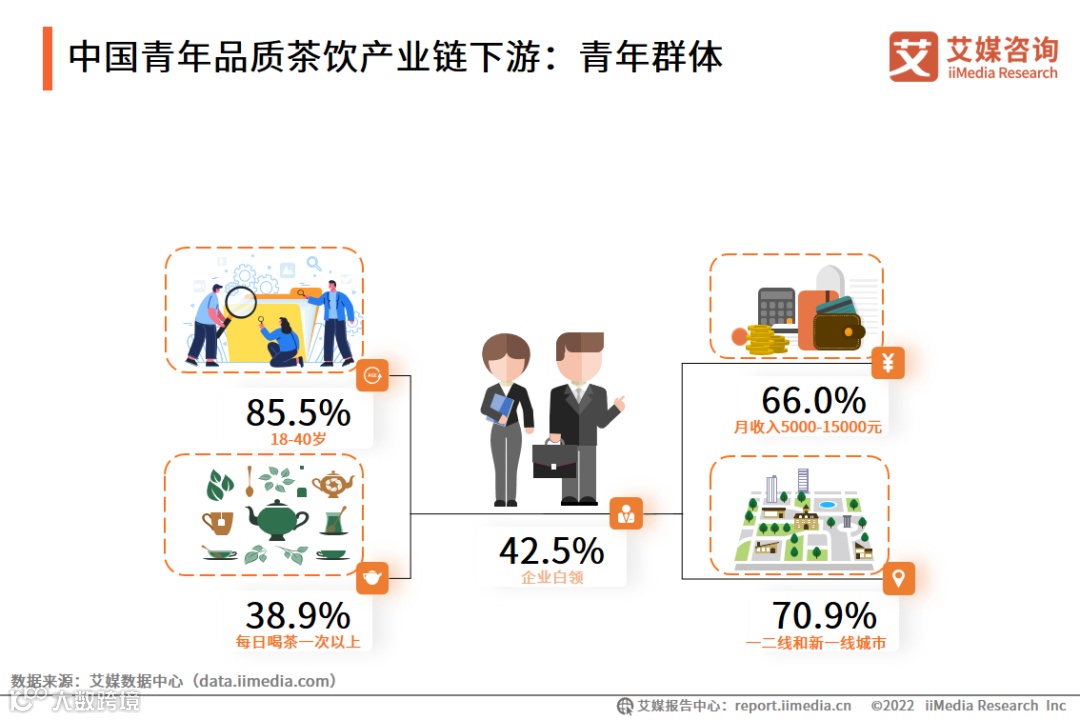 调研数据显示,中国青年品质茶饮消费者以青年群体(85.5%)为主,多数是来自一二线城市(70.9%)的中收入(66.0%)的企业白领(42.5%),具有高频饮茶习惯。