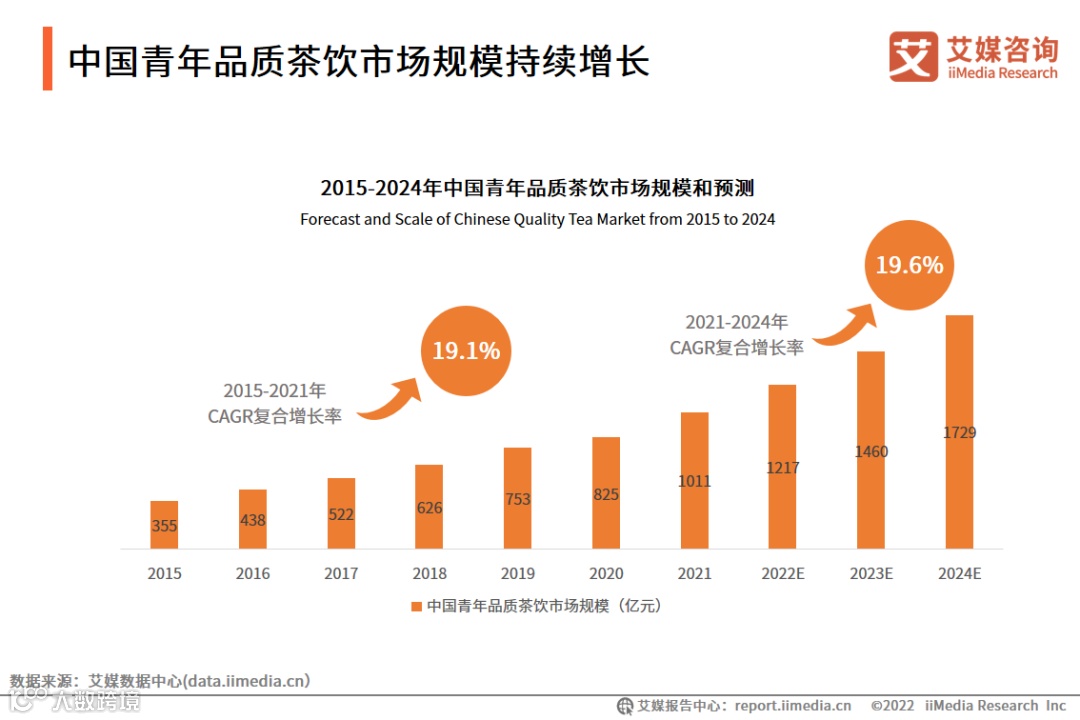 数据显示,中国青年品质茶饮市场规模从2015年至2021年持续增长,期间复合增长率为19.1%,2021年市场规模约1011亿元。预计2021-2024年复合增长率为19.6%,2024年市场规模预计达1729亿元。