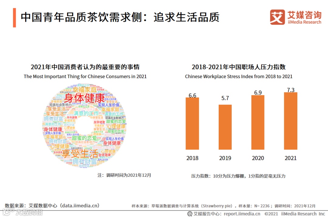 调研数据显示,2021年中国消费者认为最重要的是身体健康和享受生活。2021年职场人压力指数达到近年峰值7.3。