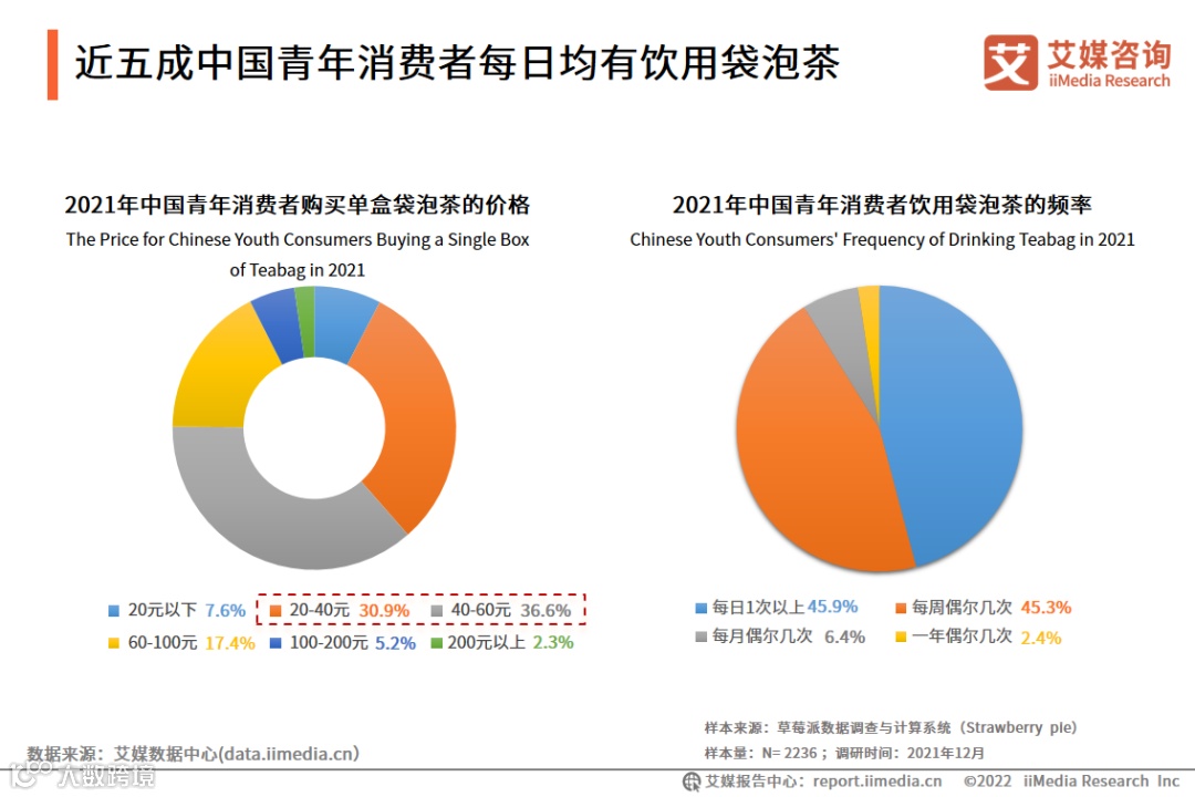 调研数据显示,超五成的中国青年消费者购买单盒袋泡茶消费金额在40-100元;近五成的青年消费者每日饮用袋泡茶一次以上。