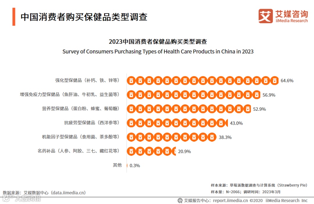 iiMedia Research(艾媒咨询)数据显示,强化型保健品、增强免疫力型保健品以及营养型保健品颇受市场消费者青睐,占比分别为64.6%,56.9%以及52.9%。艾媒咨询分析师认为,随着人们对养生观念的改观,保健品在健康中更多承担的是补充营养辅助型的责任。
